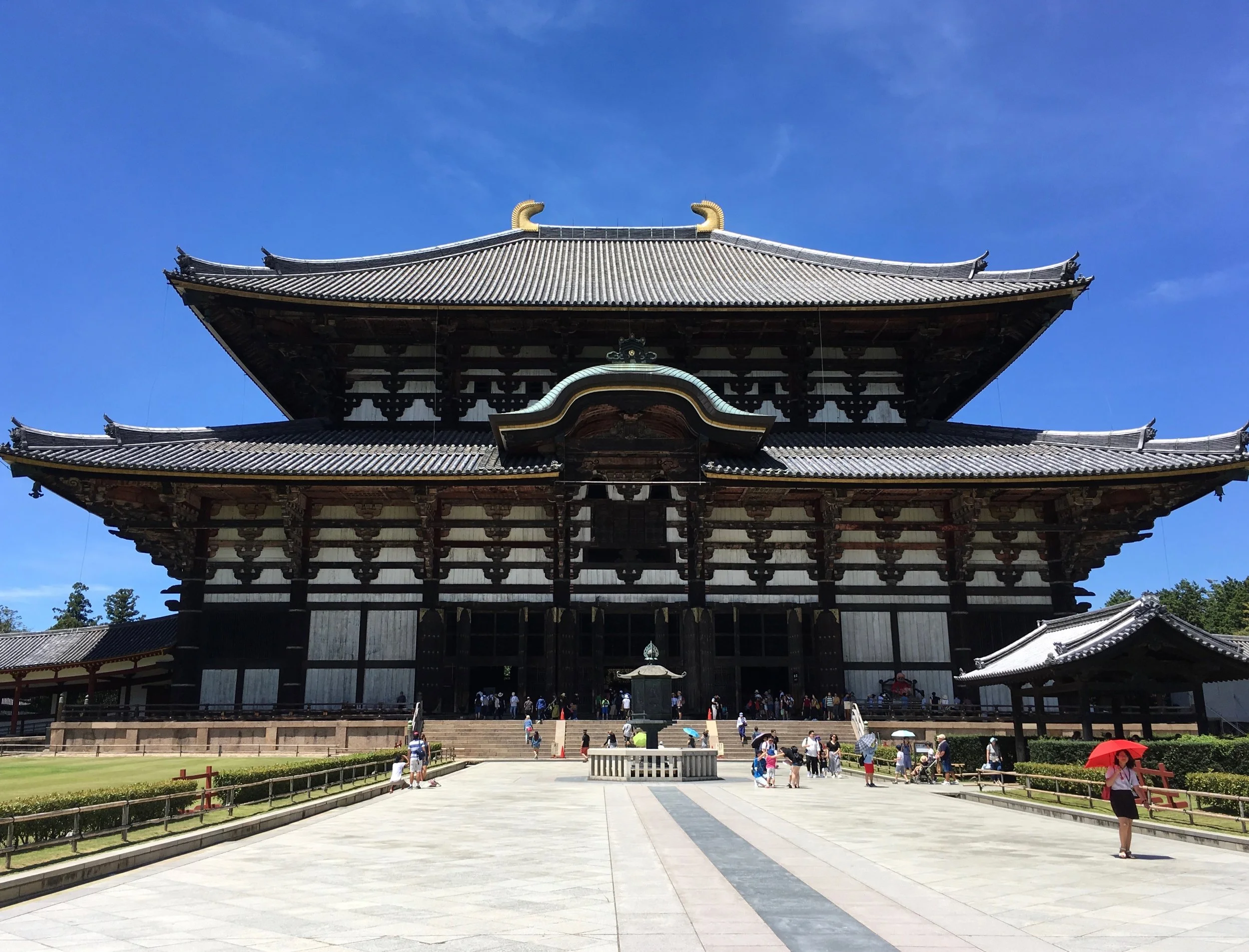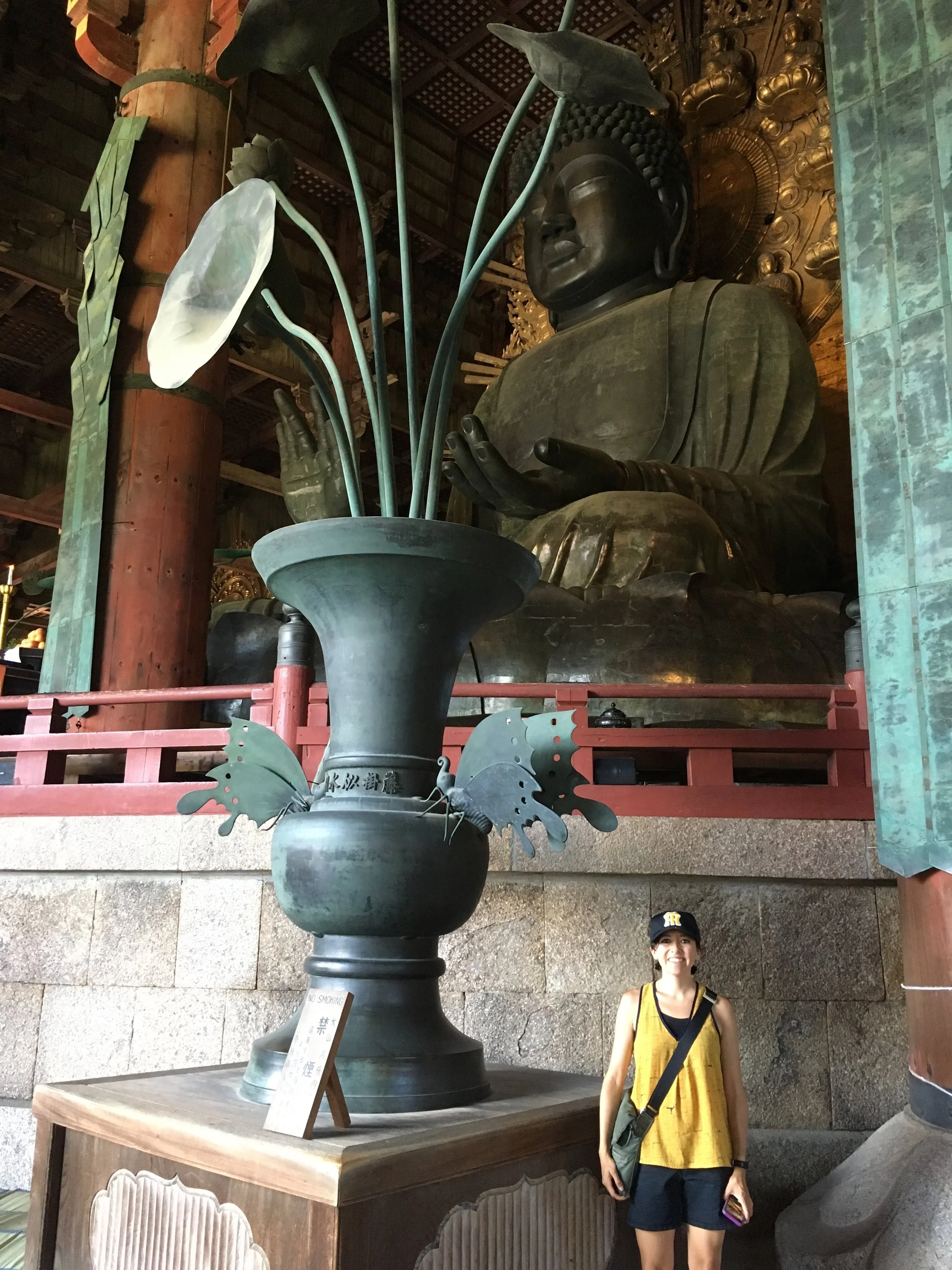 A short walk from the garden was one of the city’s highlights, Todai-ji Temple, the house of a giant buddha. On the walk up to the temple was a little desk that had a sign for ‘free tours’ and a sign saying ‘back at 1’ with a bunch of old men sitting around the table eating lunch. It was 12:57, so Sam convinced me that we should wait, and it was a good choice. Our guide was a great old dude who explained the history of everything. How it had been built in 700 as a zen temple to serve as a focal point to bring peace to the warring regions. How it had burnt down twice and the version we were seeing was built in the 1700s and was considerably smaller than the original version but was still the largest wooden building in the world when it was built. He pointed out that the brass bell out front was still the original from 700. And he further explained the complex technological problem they had to overcome to actually build a Buddha of this size (largest brass Buddha in the world, for what that’s worth). It was all very fascinating. On the last point, this Buddha is huge. Pictures do not do it justice, it is massive.