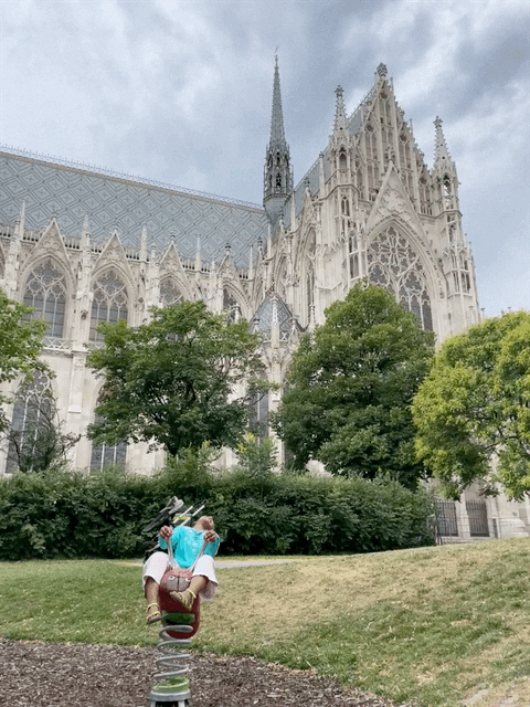 We continued walking on and landed outside the Votivkirche and its Neo-gothic architecture. It was too late to go in, but they had a fun playground beside it, so I got a few great pictures of swing sets and jungle-gyms with a church background. Really quite a lovely building.
